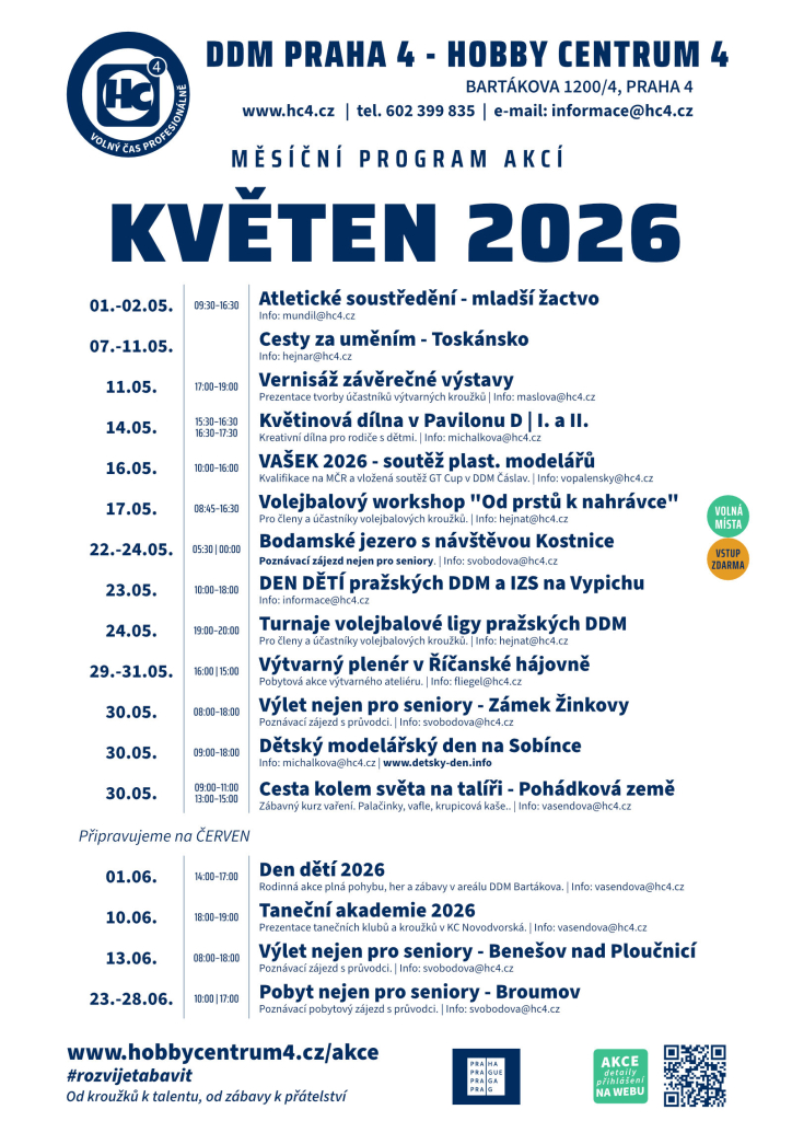 Květen v našem DDM Praha 4 / Hobby centru 4 přináší pestrý program akcí pro děti, rodiče, sportovce, tvořivé duše i seniory. Těšit se můžete na atletické soustředění, výtvarné a hudební dílny, modelářskou soutěž, volejbalový workshop, výlety i oblíbený Den dětí 2026 (dokonce 2x, na Vypichu i u nás v areálu Bartákova).