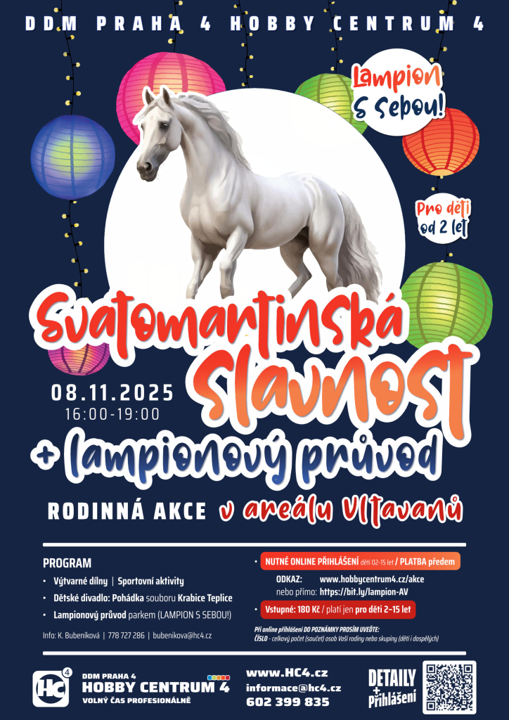 Čeká vás bohatý program plný tvoření, aktivit, světýlek a zážitků včetně divadelní pohádky v areálu Vltavanů v Praze 4. Akce je vhodná pro děti od 2 let. Prosíme, přineste si vlastní lampion.
