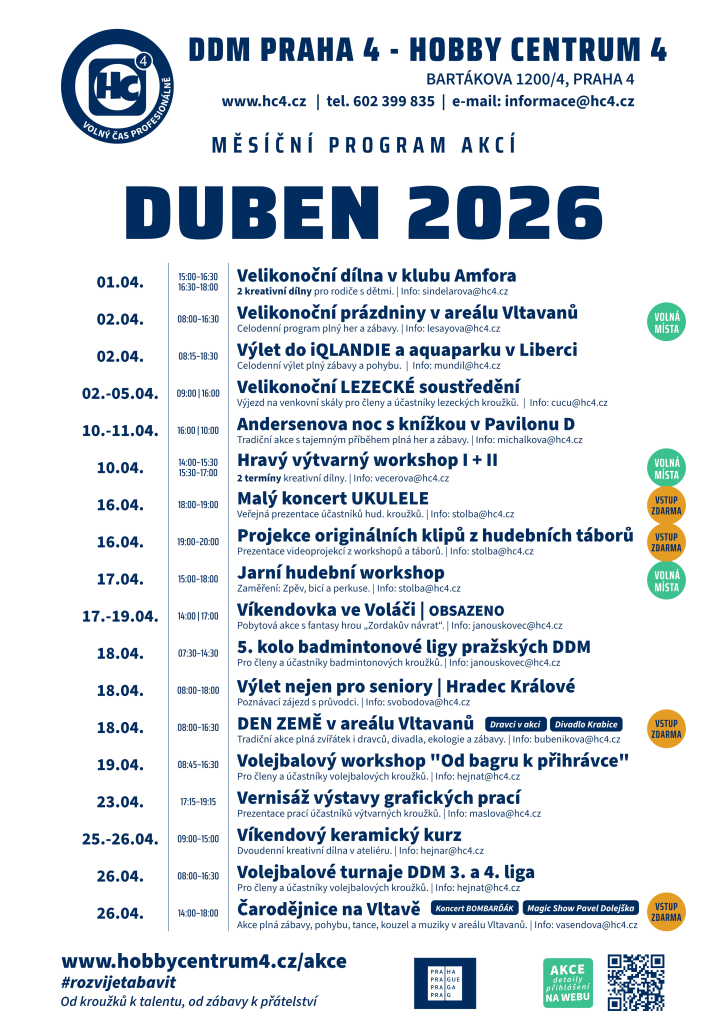Duben v DDM Hobby centrum 4 je doslova nabitý akcemi. Čekají nás velikonoční dílny, výlety, hudební a výtvarné workshopy, sportovní akce, Den Země, vernisáž i tradiční Čarodějnice na Vltavě.