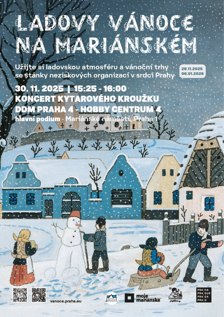 Zveme vás na vystoupení kytarových kroužků DDM Praha 4 Hobby centrum 4 s lektorkou Klárou Smetanovou na hlavním pódiu adventních trhů na Mariánském náměstí.
