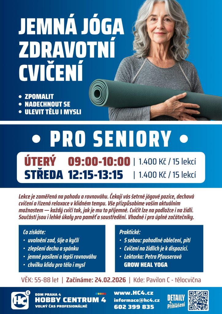 Hledáte pohybovou aktivitu, která je šetrná k vašim kloubům, pomůže vám od bolesti zad a zároveň pohladí na duši? Otevíráme nové kurzy Jemné jógy a zdravotního cvičení pro seniory pod vedením zkušené lektorky Petry Pfauserové.
